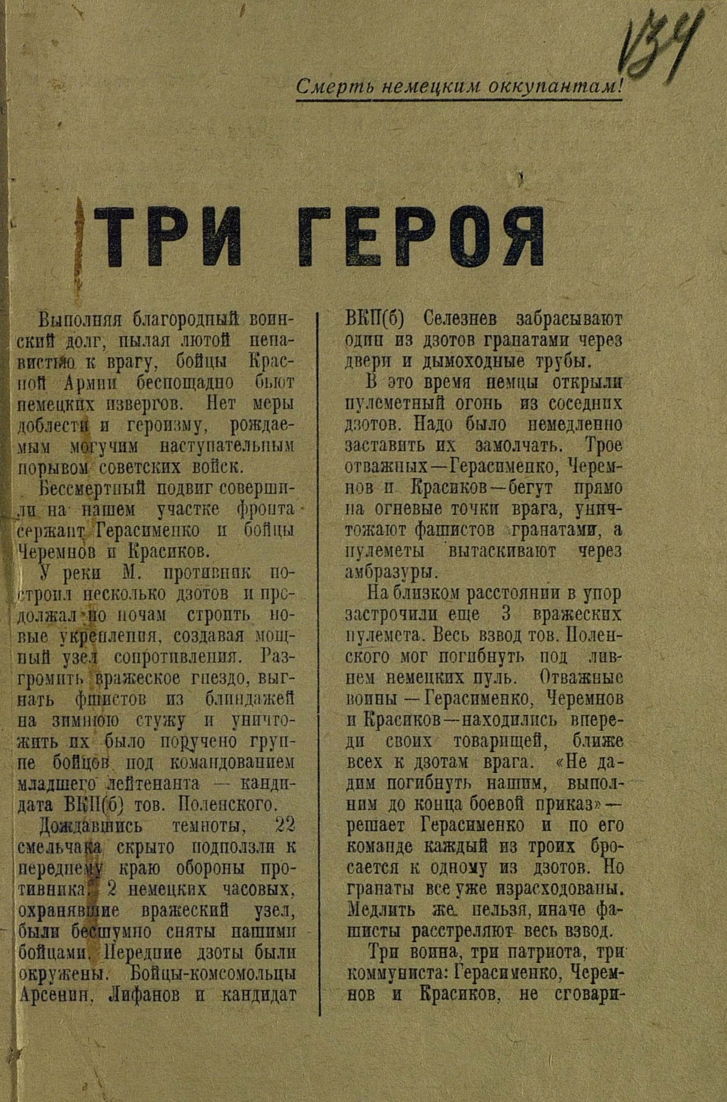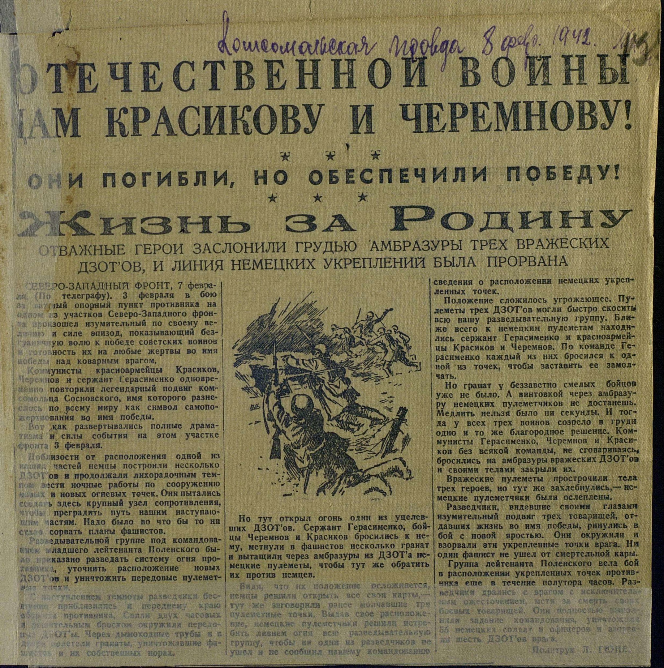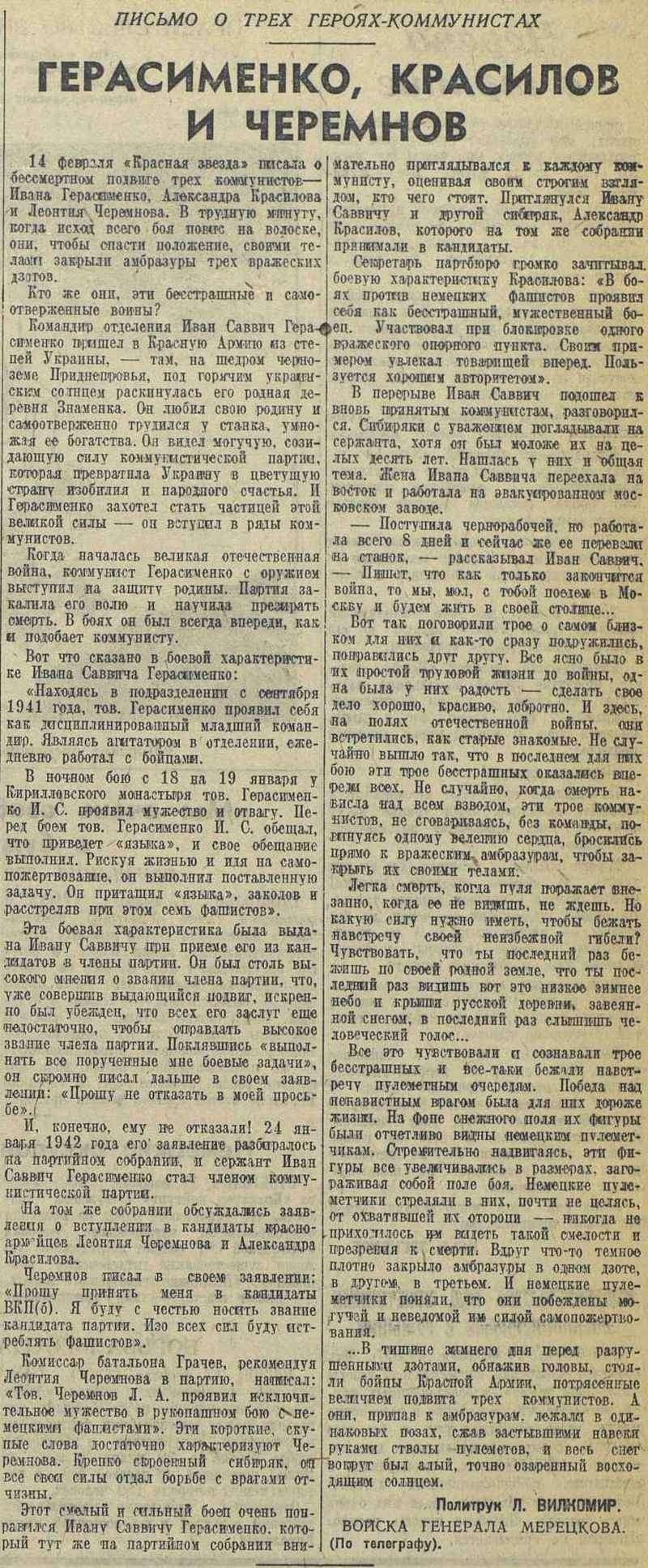 Герасименко, Черемнову и Красилову было присвоено лишь в феврале 1944 года, когда уже вся страна воспевала подвиг Александра Матросова.