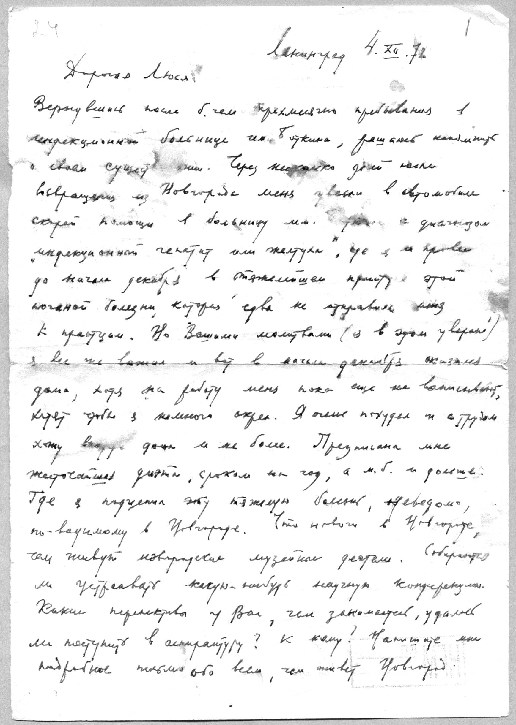 После 1972 года в период моей учёбы в аспирантуре я видела Михаила Константиновича дважды в Ленинграде, куда регулярно приезжала работать в библиотеках. Однажды мы случайно встретились на Невском проспекте. Он пожаловался на ухудшение здоровья после аварии. Последняя встреча с Михаилом Константиновичем состоялась, когда он был тяжело болен. После моего звонка он попросил прийти.