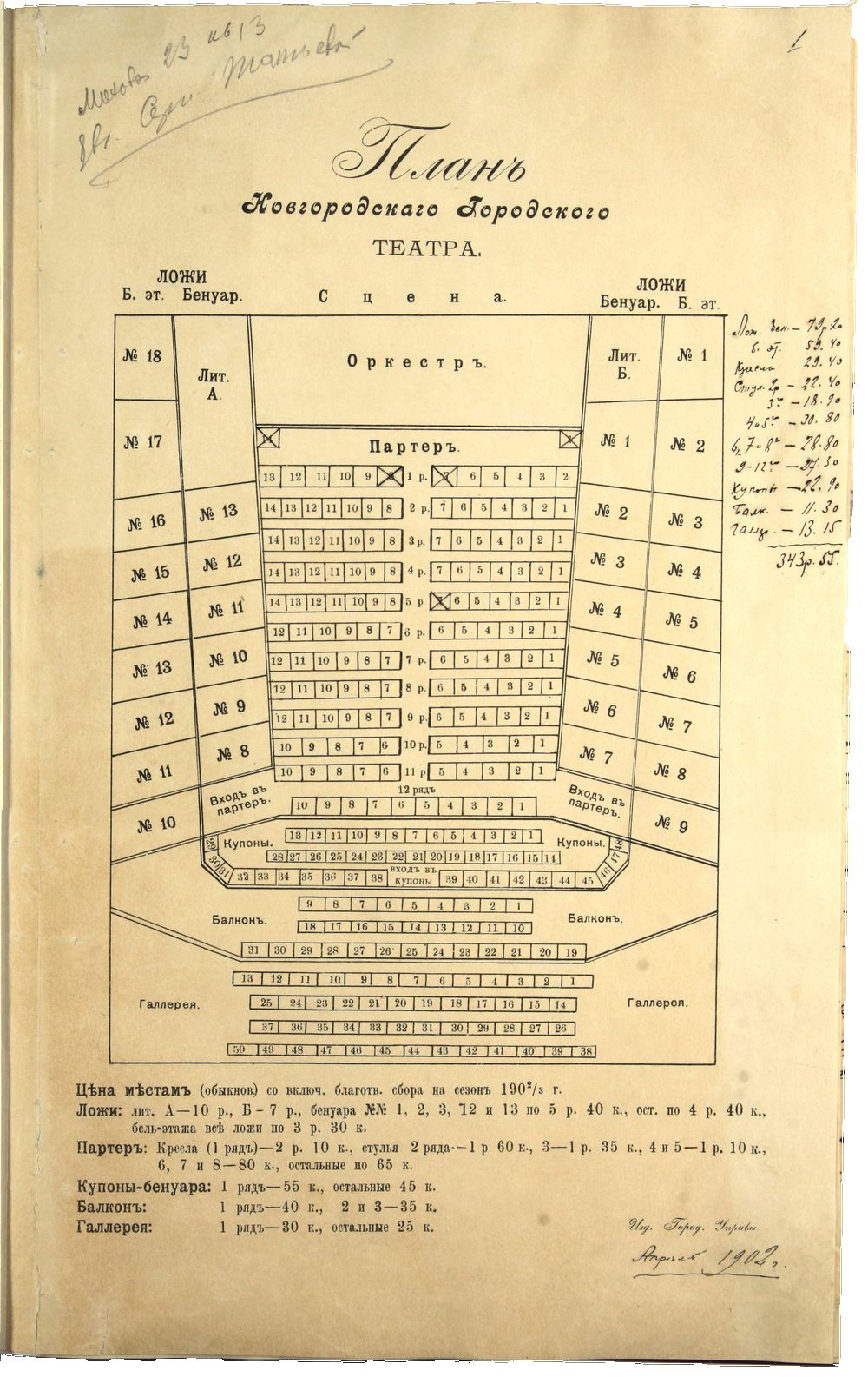 В первом новгородском театре было «чисто, опрятно, прилично». Устроили два ряда кресел, два дивана, девять рядов стульев и галерею. Билеты самые дорогие – рубль с полтиной, галёрка продавалась по 25 копеек. Первое представление состоялось 16 сентября 1853 года. В программе были очень популярные тогда водевили «Марфа Ивановна и Захар Захарович Собачкины, или Поставлю на своем!» (переделка С.П. Соловьёва с французского пьесы Лакоста и Лефевра), «Виц-мундир» П.А. Каратыгина и фарс «с пением и танцами в 1 действии» В.И. Савинова «Дайте мне старуху!». В газете поспешили отметить, что все актёры труппы не испортили бы и столичной сцены. Со временем на приглашения антрепренёра откликнулись артисты Императорских театров – господа Кварталов, Дмитриев и госпожа Соболева. Кроме исполнителей второго ряда, в Новгород приезжали и «первачи». Например, известный актёр московского Малого театра Василий Игнатьевич Живокини (1805–1874). Имена привлекали местных театралов, что, несомненно, сказывалось на доходности предприятия Иванова. Корреспондент подсчитал: «…в месяц он имеет 200 рублей доходу. А пусть бы и тысячу рублей доходу имел, так этого он вполне достоин».