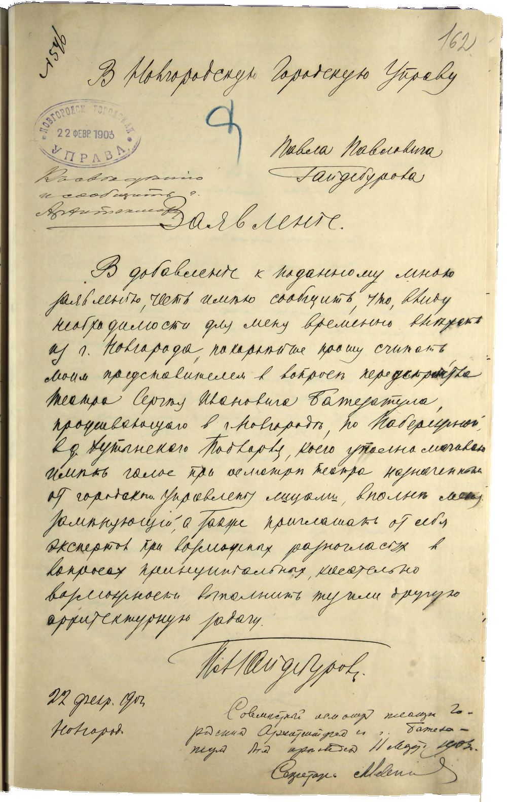 Заявление П.П. Гайдебурова в городскую управу по переустройству театра. Ф. 104. Оп. 1. Д. 1070. Л. 162