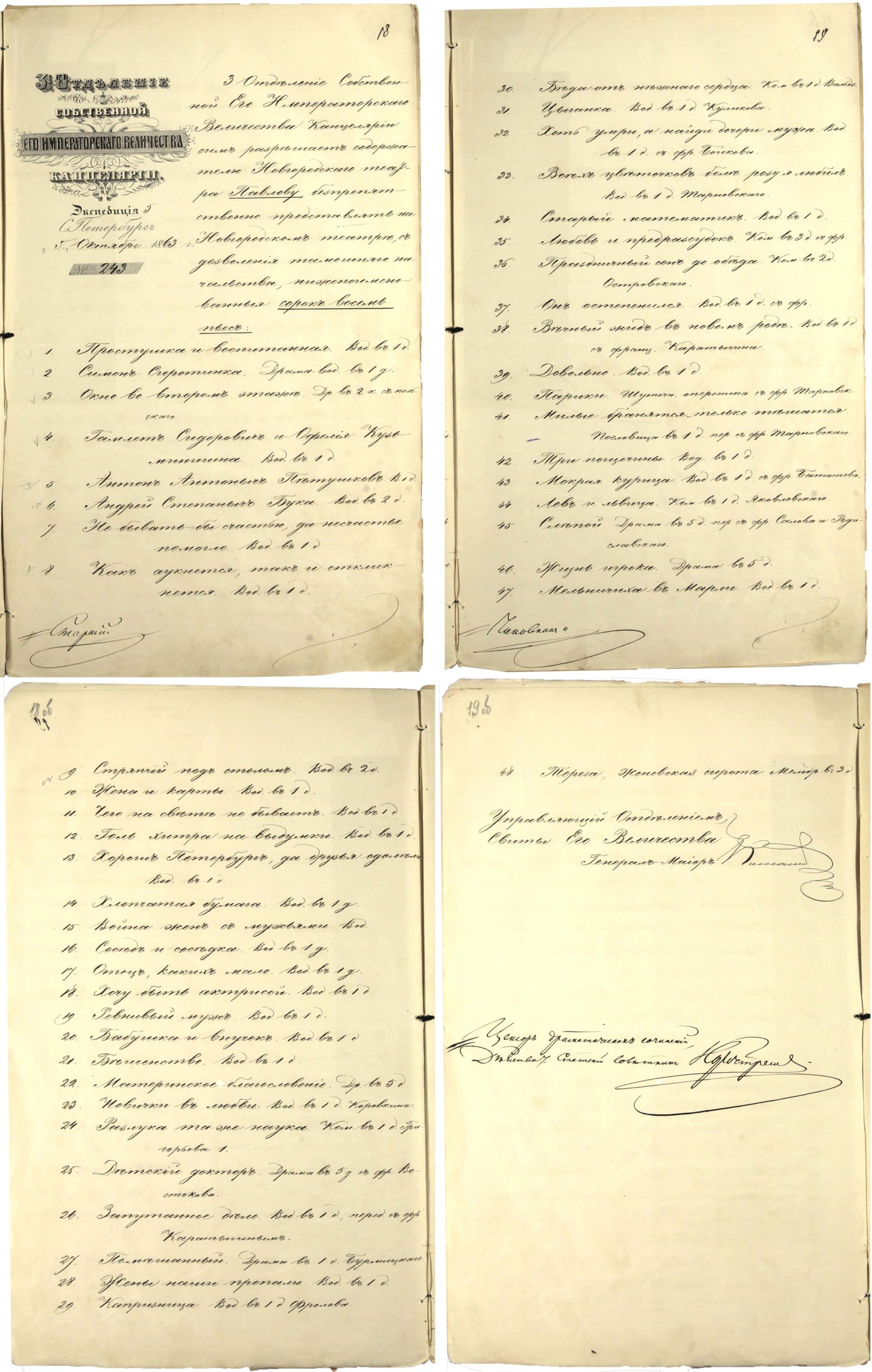 Уведомление цензора 3-го Отделения Его Императорского Величества канцелярии содержателю Новгородского театра Павлову о разрешённых к постановке пьесах. 5 октября 1863 г. Ф. 138. Оп. 1. Д. 2314. Л. 18.