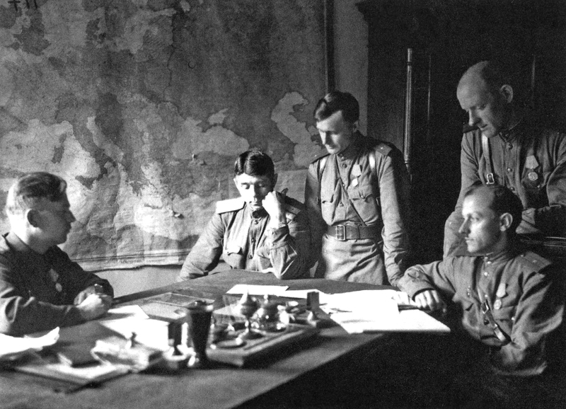 Офицеры ЛШПД: майор А.Ф. Михайлов – начальник отдела материально-технического обеспечения; ст. лейтенант Н.П. Виноградов – начальник финотдела; лейтенант Г.В. Воробьёв – помощник начальника финотдела; неизвестный; майор Г.И. Яковлев – ст. помощник начальника отдела материально-технического обеспечения. Ленинград. 1944 г. Фото Р.С. Гатовского. ЦГАИПД СПб. Ф. Р-116л. Оп. 16. Д. 117. Л. 1