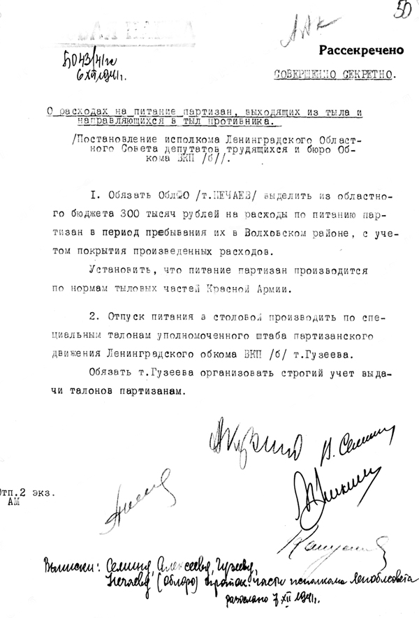 «О расходах на питание партизан, выходящих из тыла и направляющихся в тыл противника» от 6 декабря 1941 года, областной финотдел был обязан выделить 300 тысяч рублей на расходы по питанию партизан в Волховском районе. При этом нормы питания соответствовали нормам тыловых частей РККА и осуществлялись под строгим контролем уполномоченного обкома партии А.А. Гузеева.