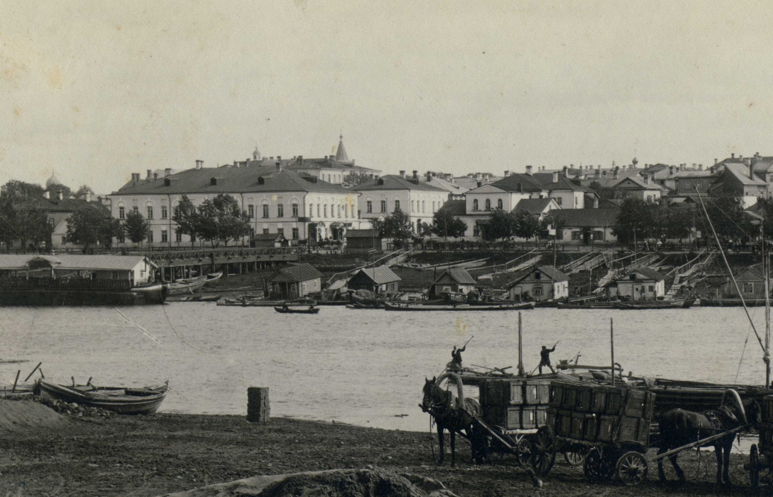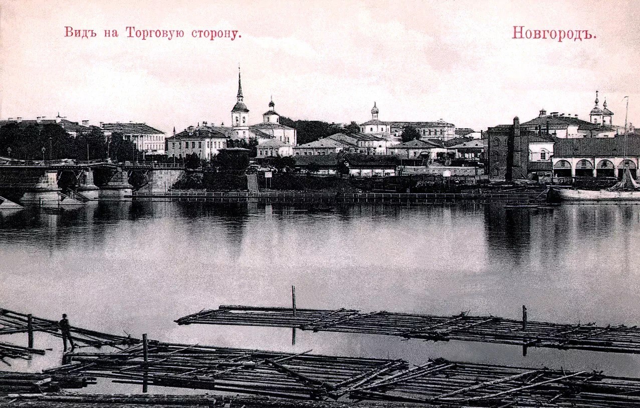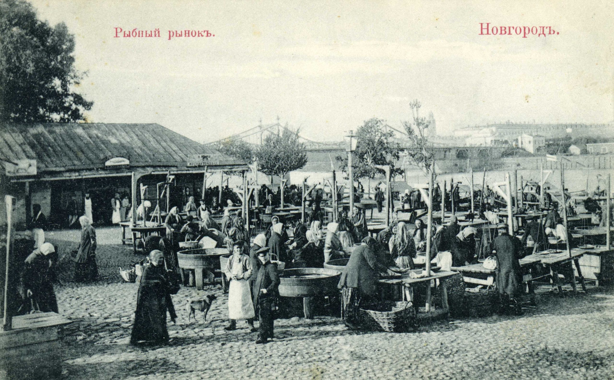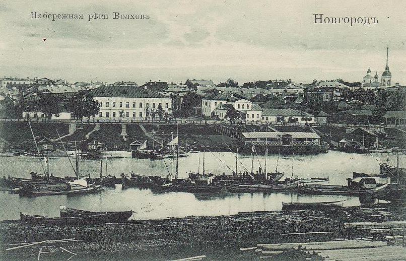 Мы вышли на набережную Волхова, куда и монастырский дом выходил главным фасадом. Набережная грязная, вонючая, покрыта была в два ряда большими, опрокинутыми к верху дном чанами; между чанами были настланы доски, по ним двигалась толпа народа, рассматривавшего рыбу, плескавшуюся в воде на чанах. Против самой улицы деревянные мостки вели к пароходной пристани, от пристани направо, на больших плотах, были построены маленькие домики рыбаков, затейливо раскрашенные, налево от пристани стояло у берегу много лодок и челнов, из них большими саками носили мужики на чаны рыбу.