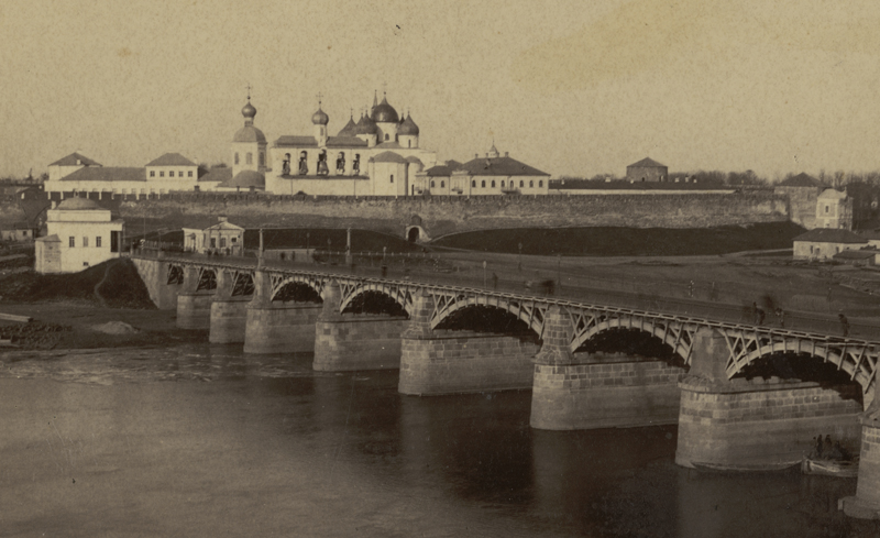 Прямо передо мною возвышалось здание городской думы. Над двумя этажами лавок был надстроен третий, в виде мезонина, где помещалась дума; каменное крыльцо в нее, приделанное снаружи, было очень затейливой архитектуры, особенно была интересна кровля над крыльцом: утвержденная на тонких железных прутьях, она очень походила на огромную летучую мышь. С левой стороны спускался под гору на площадь гостиный двор. Направо красивый каменный мост через Волхов вел к крепости или детинцу.