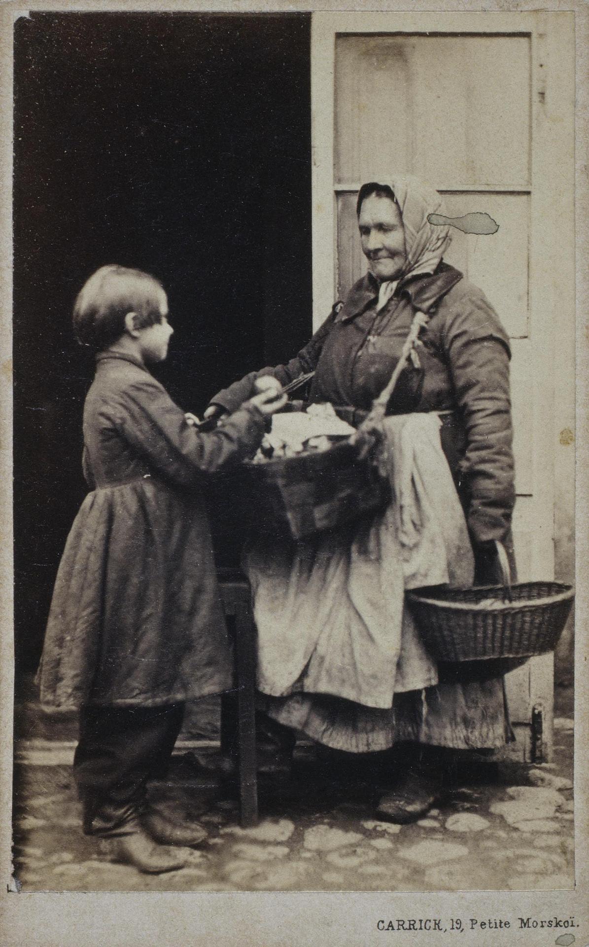 Понабравши в кулек мелких окуней, плотиц и ершей, мой хозяин отправился домой; по дороге он подошел к сидевшим у тротуара торговкам, перед которыми на рогожах были разложены свекла, морковь, лук, редька, немного свежего картофелю и зелени, сбоку в кадочках были соленые огурцы, грибы. Ерофеев начал откладывать в особую кучу коренья и торговаться. Подошел отставной солдат.